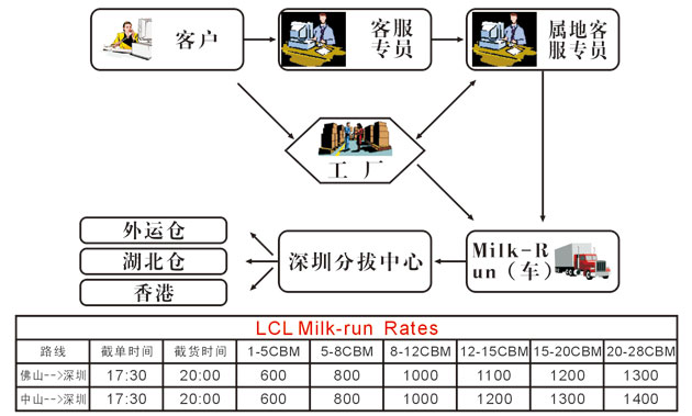 在傳統(tǒng)的散貨運(yùn)輸配送中,貨物出口是單車單票點(diǎn)對點(diǎn)的運(yùn)輸。在此模式中,物流費(fèi)用不能有效降低;為此,陸德針對散貨出口提供了對口解決方案。 MILK-RUN模式:依陸德在佛山與中山區(qū)域網(wǎng)點(diǎn),將傳統(tǒng)模式中監(jiān)管倉后移至貨源地;實(shí)行短距離接駁;提貨案例性、準(zhǔn)時(shí)率有效改良。陸德采用密封廂車定點(diǎn)定時(shí)發(fā)車,貨物第二天清晨抵達(dá)深圳分撥中心;當(dāng)天上午可以將貨物逐一送入外運(yùn)倉、金運(yùn)達(dá)倉、華南倉等出口監(jiān)管倉。操作流程:車輛裝有GPS全程監(jiān)控,采用VLMS方式進(jìn)行箱單排列,箱單中可以明確反饋貨物質(zhì)量、體積、箱麥、運(yùn)行狀態(tài)等信息。